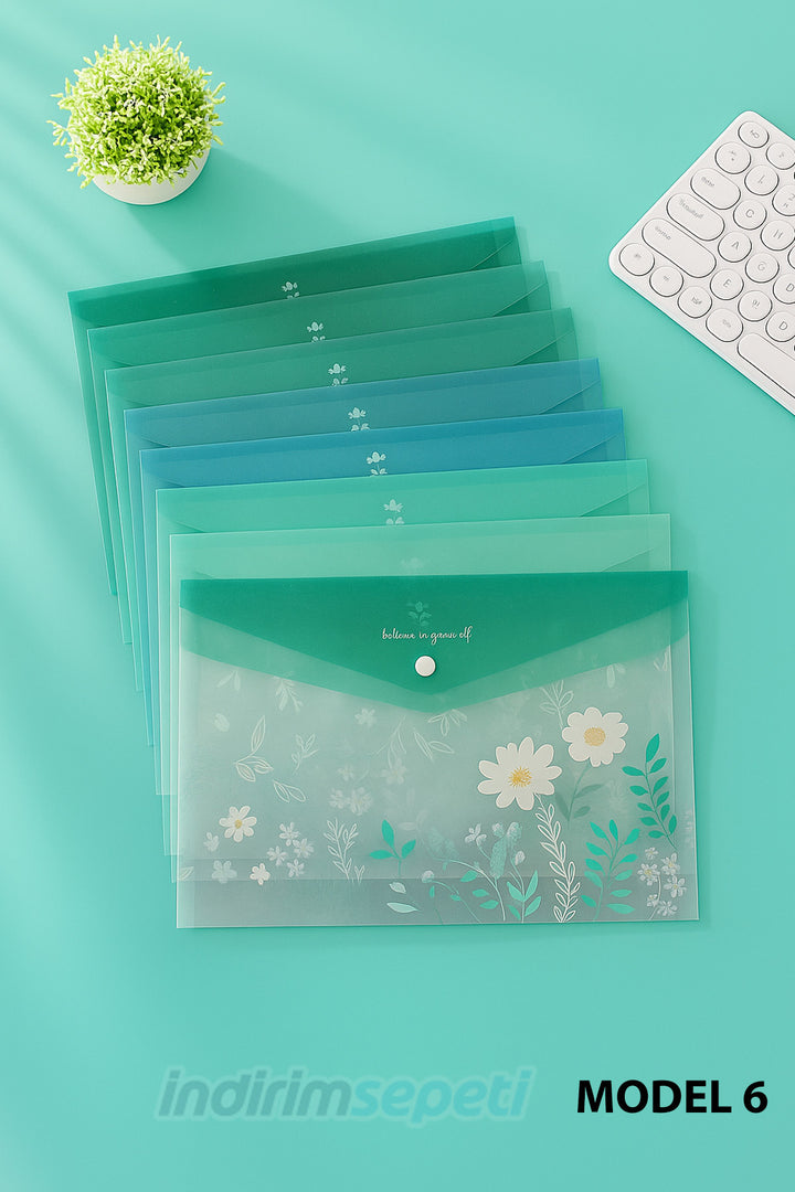 Çiçek temalı bu A4 dosya çantası, Morandi serisinin yeşil tonlarıyla hazırlanmış şeffaf ve çiçek desenli bir plastik çıtçıtlı evrak çantasıdır.