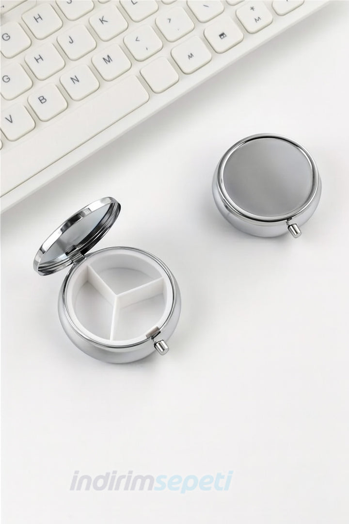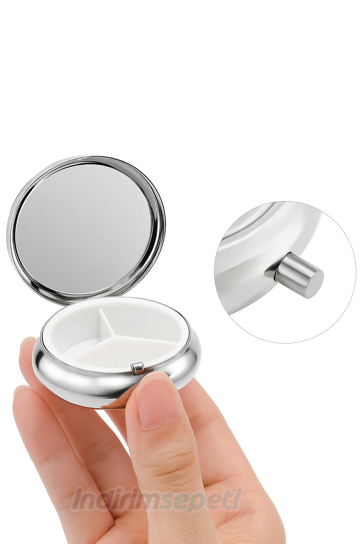 Metal İlaç Organizatörü - 3 Bölmeli Taşınabilir Yuvarlak Hap Kutusu, Seyahat Takı Küpe Saklama Kutusu, Kompakt Cep/Cüzdan Boyutu, Aynalı Kapak, Şık Metallik Kaplama