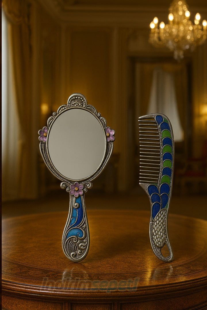 Tavus Kuşu Motifli Metal Ayna ve Tarak Seti, Klasik otantik işlemeleri ve renkli detaylarıyla öne çıkan özel bir hediyelik settir.