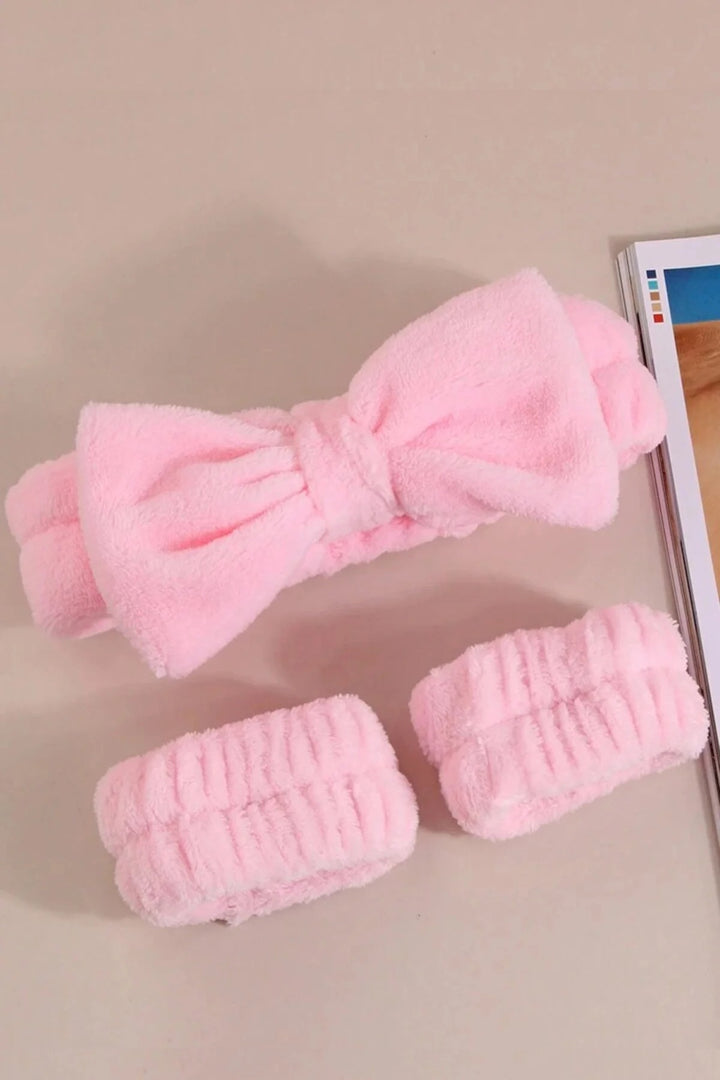 Peluş Pembe Makyaj Bandı ve 2’li Bileklik Seti – Su Akıtmaz Yumuşak Spa Yüz Yıkama & Cilt Bakım Bandı