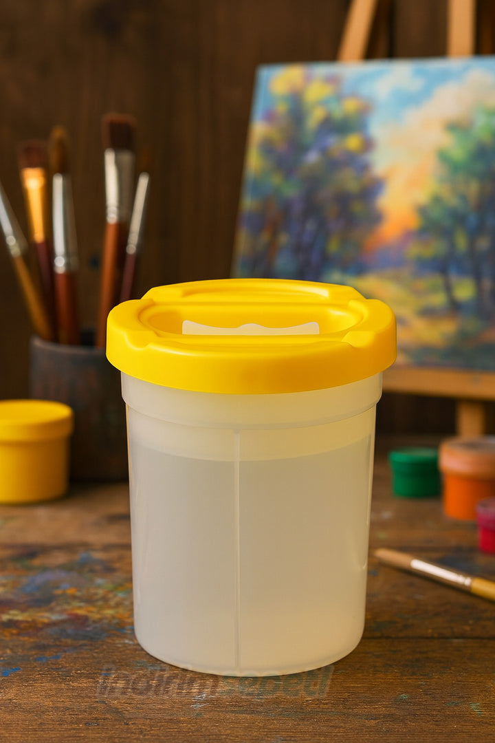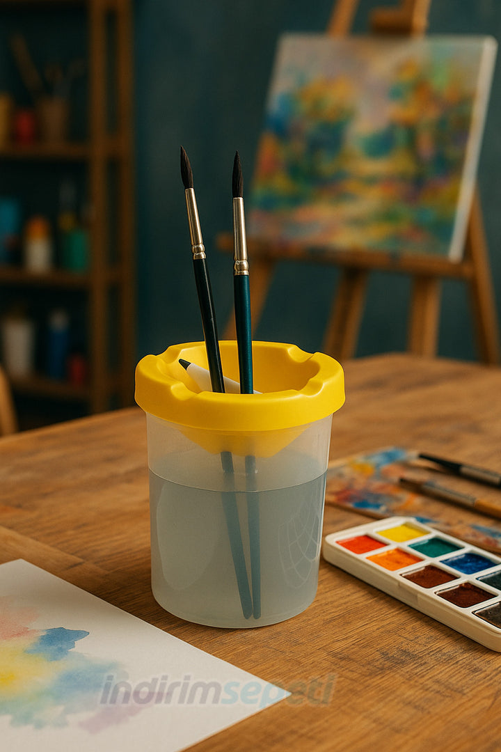 Plastik Su Kabı 16.5×9 cm, resim yaparken boya fırçalarını temizlemek için özel olarak tasarlanmış pratik ve dayanıklı bir kaptır. Boyama sırasında suyun dökülmesini engelleyen kapaklı yapısı sayesinde hem çocuklar hem yetişkinler için güvenli ve düzenli bir kullanım sunar.