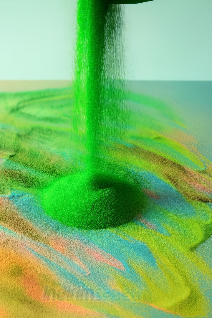 Doğayı, huzuru ve tazeliği temsil eden Yeşil Renk Kuvars Kum, hem sanatsal çalışmalar hem dekor projeleri hem de çocuk etkinlikleri için özel olarak üretilmiş ince taneli dekoratif kum türüdür. Kum boyama, kum resmi sanatı, Montessori sensory play, DIY tasarımlar, maket sahneleri, minyatür doğal peyzaj projeleri, reçine sanatı, vazo ve fanus dolgusu, akvaryum dekorasyonu ve canlı bitkisiz terraryum tasarımlarında mutlaka tercih edilir.
